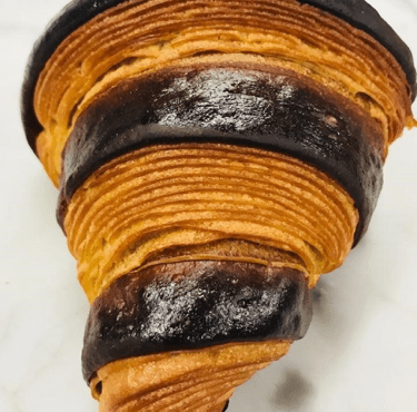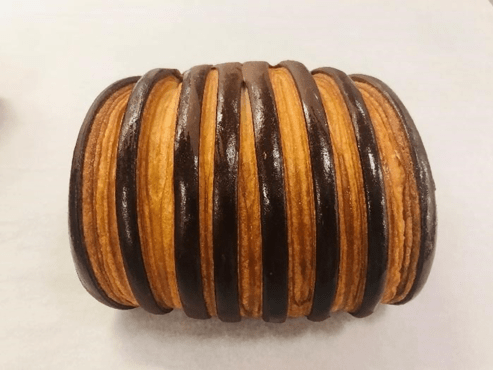 My dear friend, French master baker David Bedu, based in Florence, Italy, was the creator of the “Croissant Bicolor.” He inspired me to both mimic and recreate his legendary croissant in a different and unique form. The croissant bicolor is the fusion of a croissant dough block before sheeting with a coloured sheet of brioche. In David Bedu’s case, his iconic chocolate bicolor was created using a cocoa-flavoured brioche which covered croissant dough. There have since been countless variations of the bicolor croissant which include strawberry, raspberry, coffee, purple or blue raspberry, and green apple to mention but a few. Chocolatines also look very pretty when made using bicolour pastry, especially when scored as in the image below: