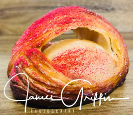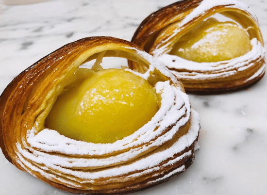 …or without! Simply insert a disc of frozen crème pâtissière into the teardrop-shaped piece of pastry, add a half of a poached/tin pear, proof and bake. Add some raspberry jam on the inside, and after baking, a sprinkle of raspberry powder to garnish.