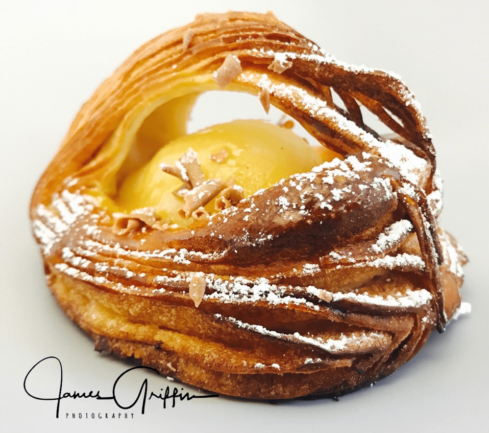 Using the same teardrop-shaped cutter as for the raspberry pear marinade, this creation is a delicate chocolate pear basket. The thin end of the tear is rolled out thinly, frozen crème pâtissière is placed on top the pastry, followed by two chocolate bars, and half a small pear-half. The tip is stretched over the pear and tucked in under the pastry gently. As the pastry proofs, the tip gently releases from under the proofing pastry, and a handle appears to form on this beautifully tasty pastry. Can be made with chocolate…