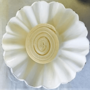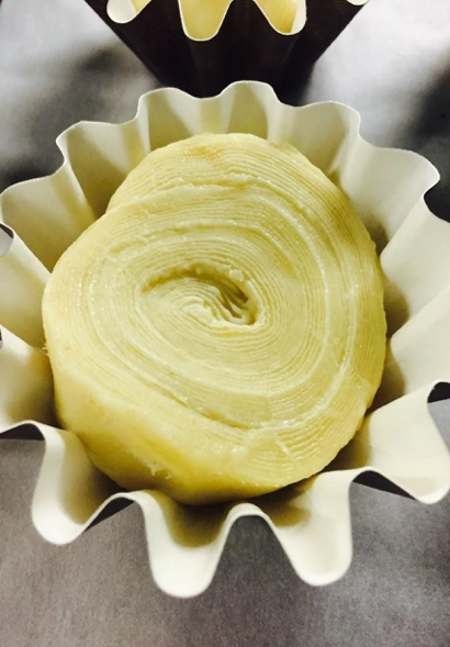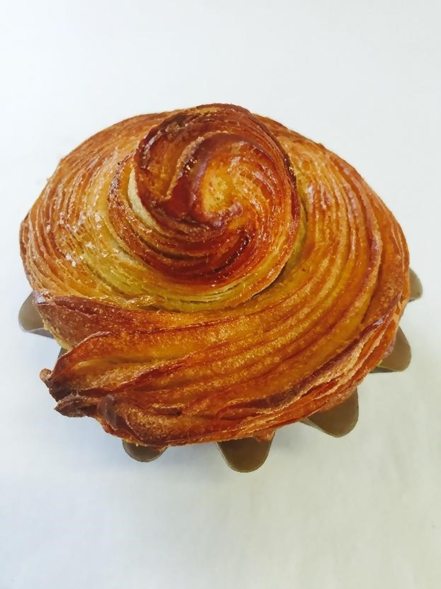 Laminated brioche is a very highly enriched pastry that is made with a butter brioche dough plus the addition of 50.7% butter based on total dough weight. The pre-dough starter contains water, but the liquids in the main dough include milk, eggs, and egg yolks. The higher hydration laminated brioche pastries are popular throughout France and Europe and command a great price for the quality of ingredients and the process used. Laminated brioche can also be used to make the legendary “Cronut”™-style product, where the pastry is proofed and then float fried instead of baked. Laminated brioche can be sold in small or larger units, typically baked in a fluted brioche shape of which there are an infinite amount of sizes. Individual brioche is made similarly to pain aux raisins, rolled into a sheet, then coiled up and cut into pieces. The smaller ones are 2cm wide and weighed 60g, the larger ones are 600g, and the shape I used was 25cm wide at the top. Brioche shapes can be purchased in metal, and there are also one-use disposable cardboard ones coated with silicone.