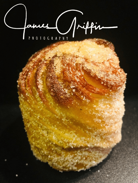 The cruffin was originally created by Kate Reid of Lune Croissanterie in Melbourne, Australia in 2013. A Cruffin is a hybrid of a croissant and muffin. Cruffin-style pastries are popular and easily made from my croissant pastry recipe. To make them extra crunchy, the pastry block is opened out before sheeting, dredged with sugar, refolded, sheeted to 4 mm and cut into strips of approximately 3cm wide and 25 cm long. Just before baking and after proofing, I dredge them with castor sugar using a small sieve to help caramelise the pastry more during the bake. After baking, they are cooled, filled with Nutella and garnished with a light dust of icing sugar. You can use a range of jams, curds, custards, ganaches and other fillings to make a beautiful selection of these pastries.