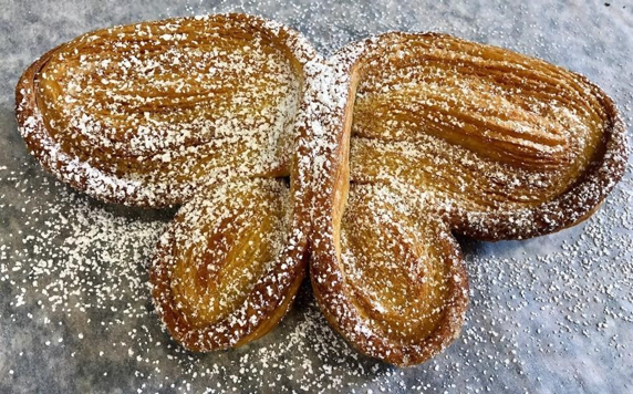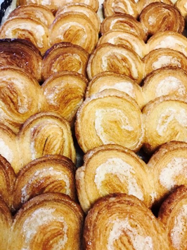 Palmiers are a personal favourite, and if palmiers are being made from butter puff pastry, copious quantities of sugar should be applied following sheeting of the third 4-fold. The sugar should also be gently squeezed into the pastry at this stage using light pressure from a rolling pin or on a sheeter.